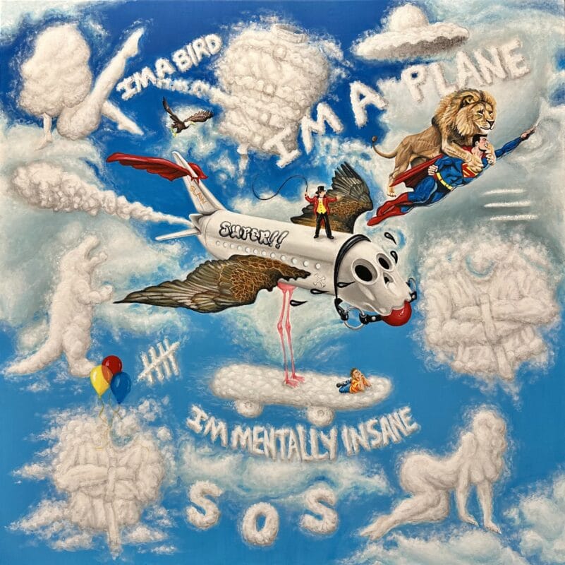 I’m a bird, I’m a plane, I’m mentally insane explodes like a fever dream against a clear blue sky. Figures, animals, and text emerge from clouds that double as both image and thought. Superman and a lion streak through the air beside a winged jet marked “Super.” Balloons, angels, and smoke signals spell the words of a mind unraveling yet still performing its own spectacle.