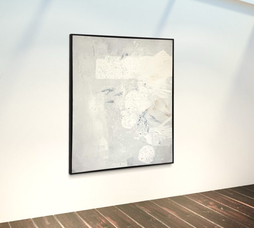 Oyster Sheen anchors the Linen Series with a luminous field of muted whites and soft grays, inspired by the inner shimmer of oyster shells. Delicate craquelure, organic Halo Accents, and rainfall drips animate the surface, creating an organic rhythm that oscillates between stillness and movement. Subtle bursts of mandarin orange offer warmth and contrast, inviting viewers to reflect on the elegance of imperfection and the beauty of quiet transformation.