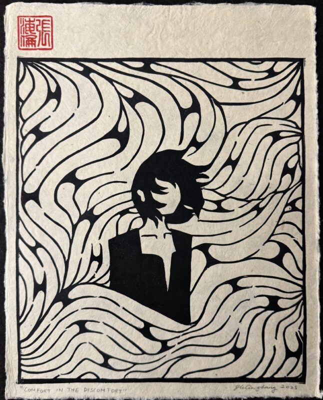 Her work merges psychological expression with traditional East Asian symbolism. Through flowing linework, rhythmic repetition, and the careful balance of positive and negative space, Zhang constructs visual landscapes shaped by memory, emotion, and embodiment. The physical act of carving is central to this process. Because the medium is irreversible, each cut becomes a permanent record of the moment in which it was made.