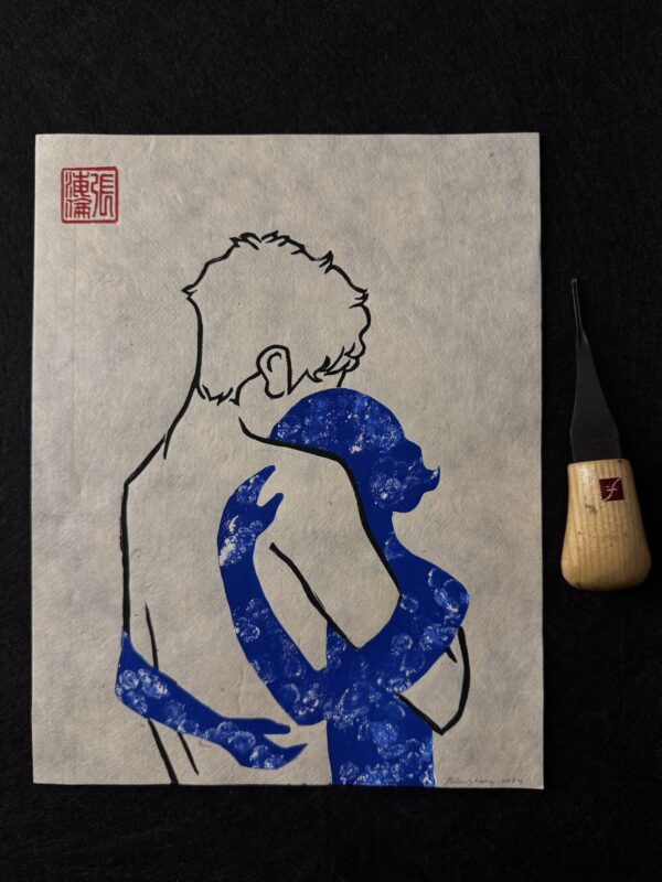 Printed on lokta paper using a hand carved block, the work reflects Zhang’s interest in the body as a vessel for emotional experience. The composition suggests connection not through detail but through gesture. The figures are defined by presence and proximity rather than realism.