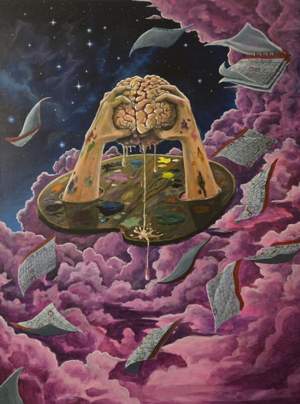 The painting extends his surrealist language, balancing the detailed realism of form with a dreamlike suspension of logic. It is a reminder that imagination can be both sanctuary and mirror, that within the dreamlike we often find the truest reflection of ourselves.