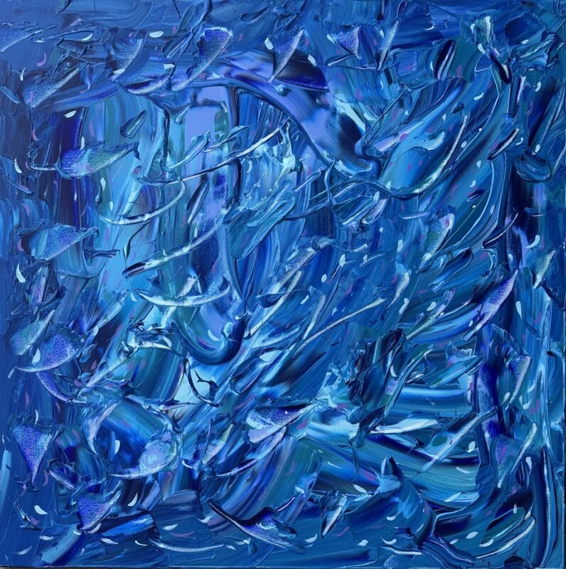 Where Currents Collide captures the flow of energy as both visual and emotional force. The painting explores the language of movement through form and reflection, portraying water not as subject but as metaphor. Within the layered surface, light folds and expands like memory, inviting the viewer to follow its rhythm.
