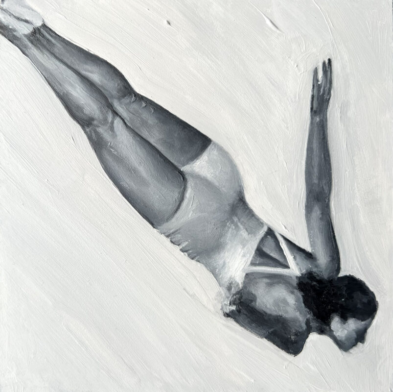 These paintings explore the fragile threshold between hesitation and courage. The figures twist, dive, and spiral through space, embodying the psychological moment when a person decides to move forward despite uncertainty.