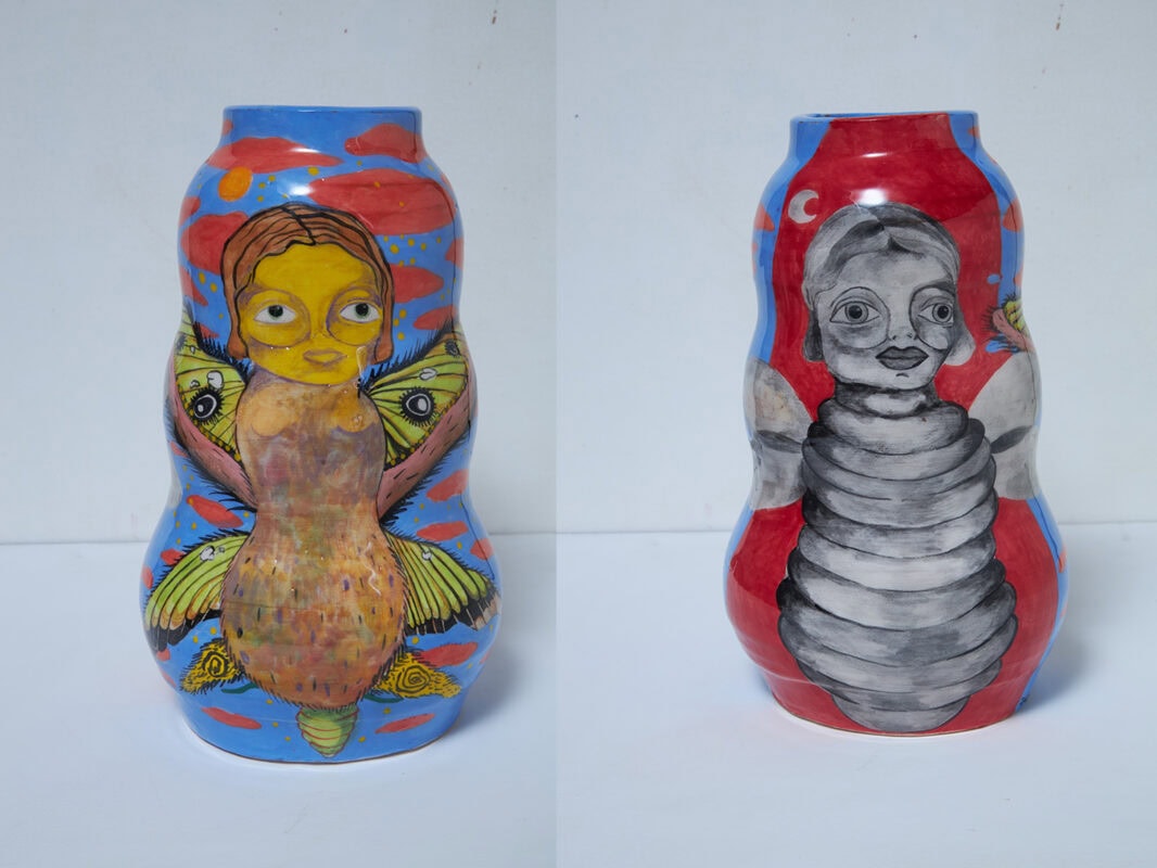 Solakoğlu’s practice extends across painting and ceramics. Beginning with ink and watercolor, she later embraced oil paint and clay, allowing her narratives to move fluidly between surface and structure. Her handmade vases become sculptural continuations of her paintings, carrying the same spirit of imagination and introspection. The imagery, often drawn from mythological or literary archetypes, serves as a mirror for her own evolution.